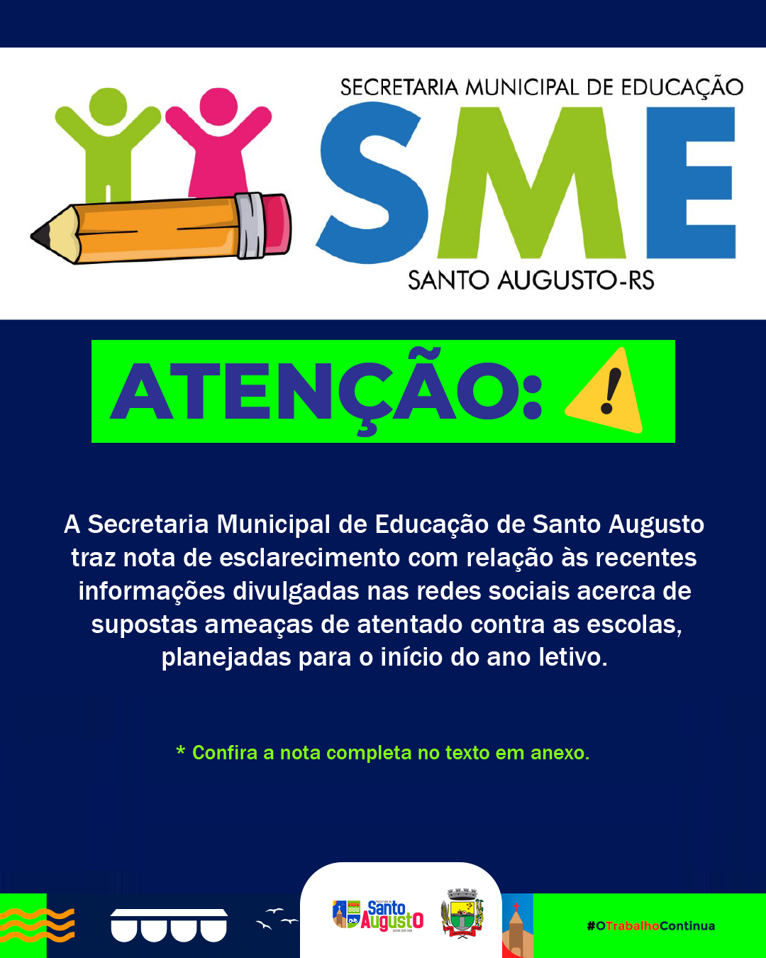 👁️ Ressaltamos que a Secretaria Municipal de Educação permanece acompanhando a situação de forma permanente, em articulação com os órgãos competentes, prezando pela segurança e pelo bem-estar de toda a comunidade escolar.