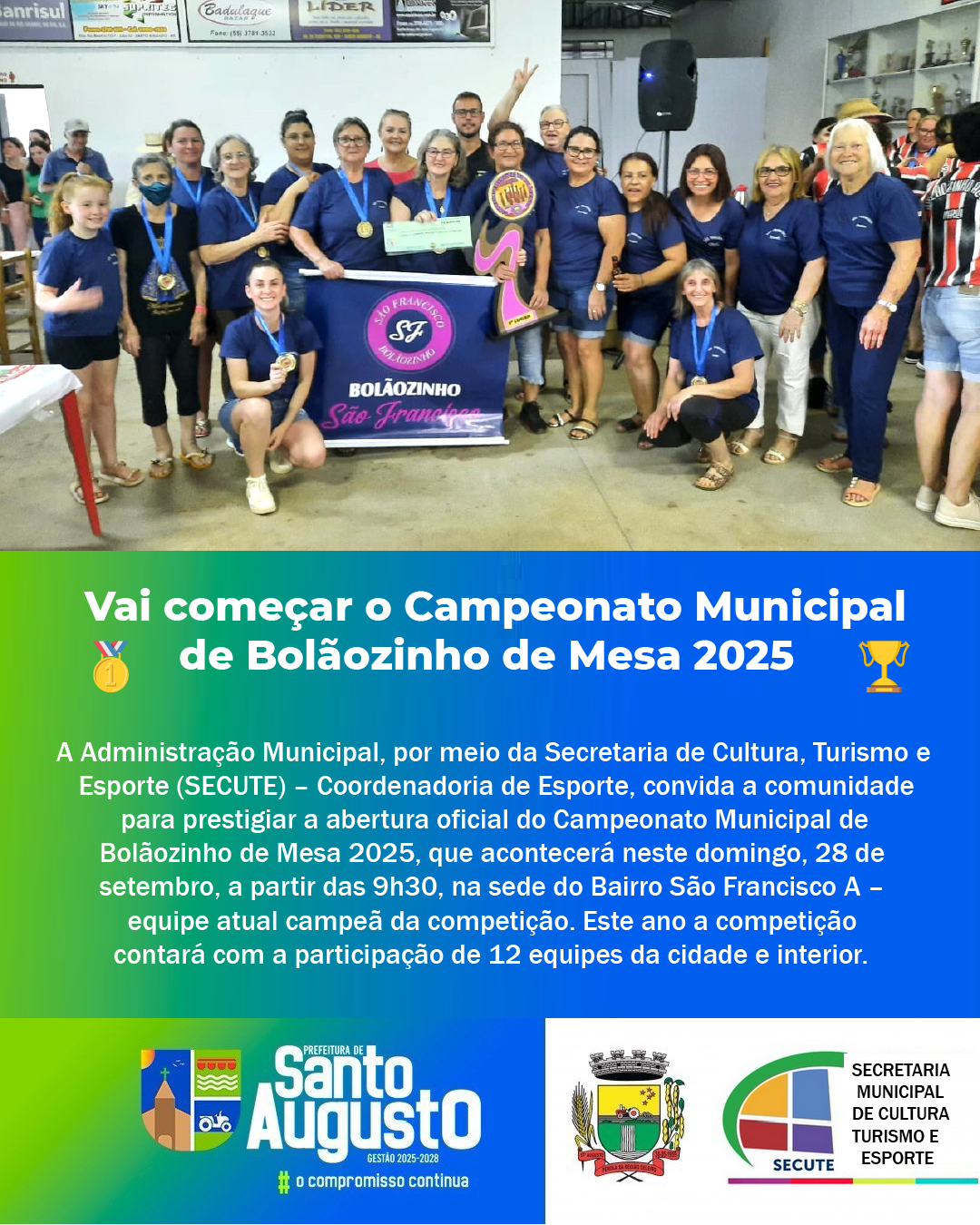 🗣A Administração Municipal, por meio da Secretaria Municipal de Cultura, Turismo e Esporte (SECUTE) – Coordenadoria de Esporte, convida a comunidade para prestigiar a abertura oficial do Campeonato Municipal de Bolãozinho de Mesa 2025, que acontecerá neste domingo, 28 de setembro, a partir das 9h30, na sede do Bairro São Francisco A – equipe atual campeã da competição.