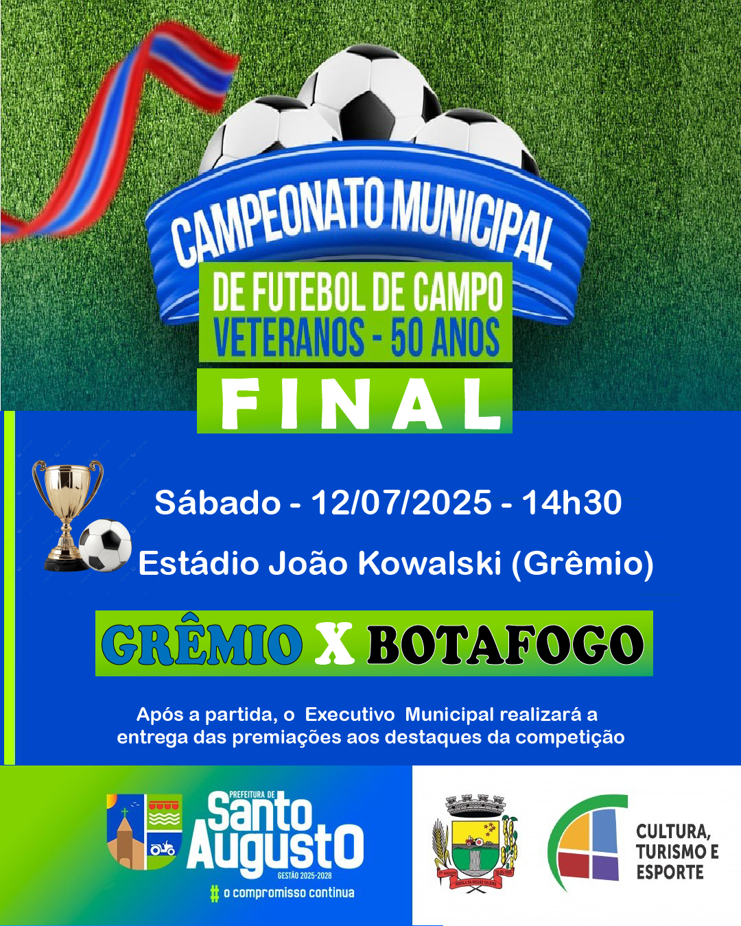 ✅ A Administração Municipal, por meio da Secretaria de Cultura, Turismo e Esporte (SECUTE), convida todos os desportistas e a comunidade em geral para prestigiar a grande final do Campeonato Municipal de Futebol de Campo – Categoria Veteranos 50 Anos.