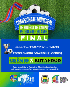 ⚽️ No último sábado, 12 de julho de 2025, no Estádio João Kowalski (Estádio do Grêmio), foi realizada a grande final do Campeonato Municipal de Futebol de Campo – Categoria Veteranos 50 Anos. A competição foi organizada pela Administração Lilian/Mattioni, por meio da Secretaria de Cultura, Turismo e Esporte (SECUTE), através da Coordenadoria de Esportes.
