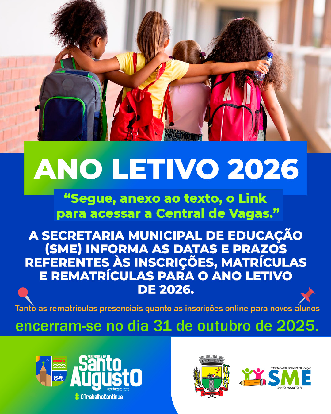 Nos últimos 4 itens você deve acessar a Central de Vagas para a inscrição, no seguinte link: https://santoaugusto.educarweb.net.br/serv…/matricula-2026