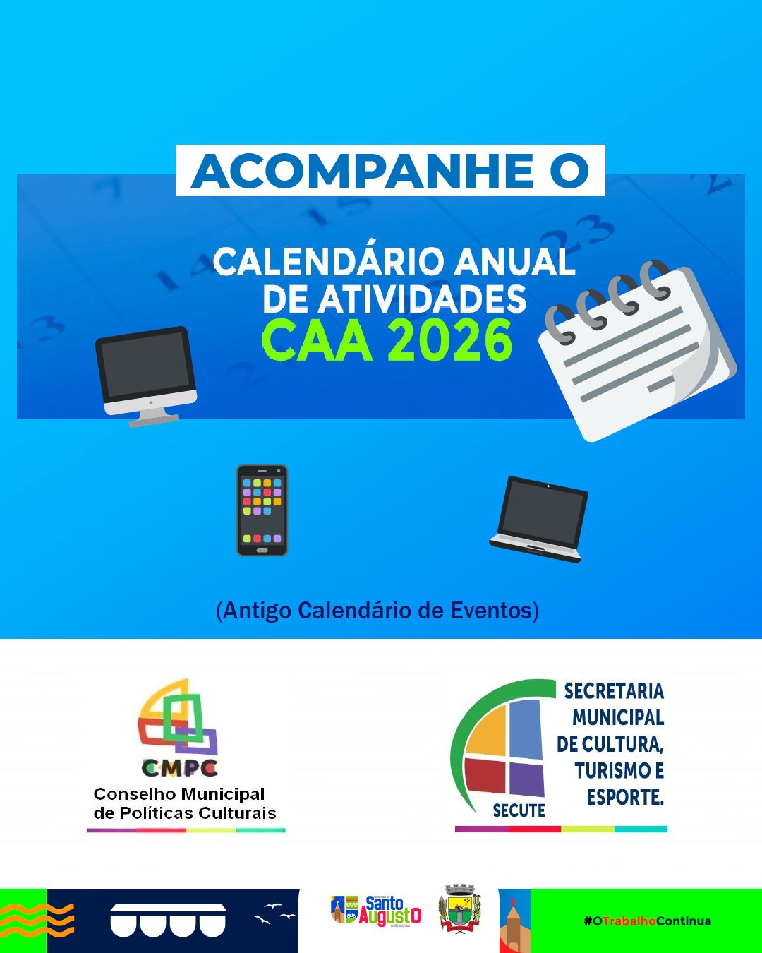 O Conselho Municipal de Políticas Culturais – CMPC juntamente com a Secretaria Municipal de Cultura, Turismo e Esporte – SECUTE comunicam que o CALENDÁRIO ANUAL DE ATIVIDADES – CAA está divulgado no site oficial da Prefeitura Municipal de Santo Augusto https://santoaugusto.rs.gov.br/calendario-anual-de…/