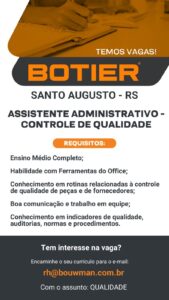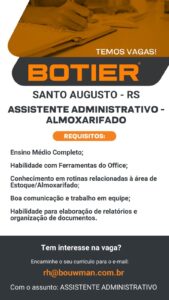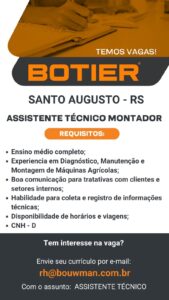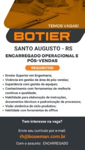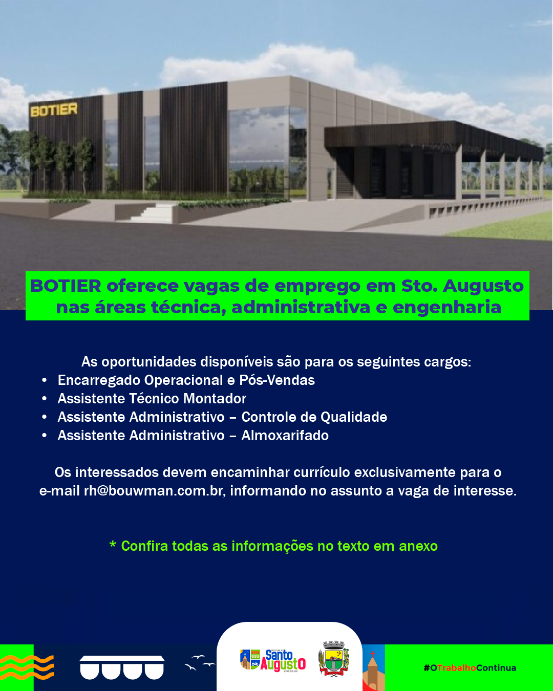 BOTIER oferece vagas de emprego em Santo Augusto nas áreas técnica, administrativa e engenharia