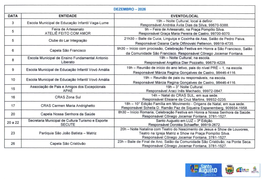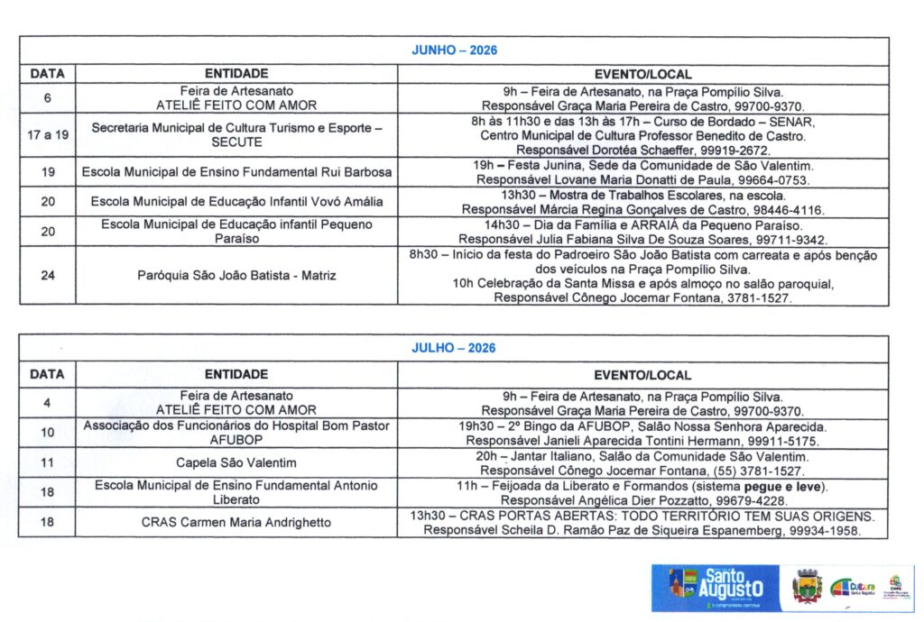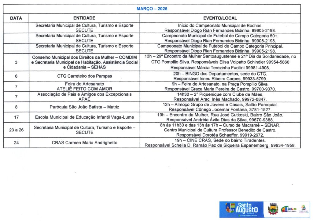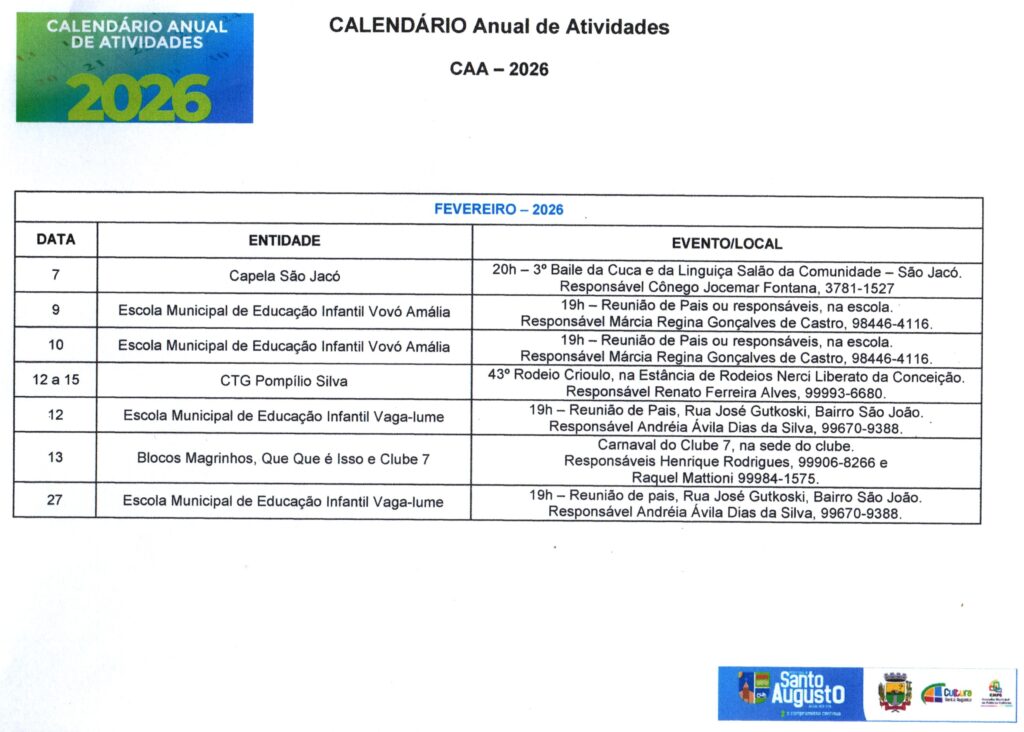 (Esse processo substitui o antigo Calendário de Eventos do Município) ?Nesta sexta-feira, 17 de janeiro, a Secretaria Municipal de Cultura, Turismo e Esporte – SECUTE comunicou sobre o CALENDÁRIO Anual de Atividades – CAA do ano de 2025, que, a partir de agora deverá ser preenchido no Formulários Google, através do link https://forms.gle/p7pQU9fhtgRrgDro9 ATÉ O DIA 28 DE FEVEREIRO. ?O Calendário Oficial de Eventos do Município está presente na SECUTE há tempos. Porém, desde a criação do Conselho Municipal de Políticas Culturais – CMPC, instituído pela Lei Municipal N.º 3.282, de 5 de julho de 2023, que é o órgão consultivo na formulação, acompanhamento e avaliação da política cultural do município de Santo Augusto/RS, foi instaurado, em seu Regimento Interno, o CALENDÁRIO Anual de Atividades – CAA. ?A partir deste ano, o CAA será com inscrição dos eventos de forma online, com prazo para preenchimento e à disposição de toda comunidade em formato digital, logo após a divulgação em DECRETO OFICIAL (março), facilitando a informação, consulta e acesso, bem como a organização de datas/dias. ?Encerrado o prazo, será divulgado, oficialmente, através de Decreto Municipal com Anexo do CAA e todos os eventos devidamente efetivados. Aqueles EVENTOS que não forem cadastrados no período divulgado, até poderão acontecer, mas não farão parte deste Decreto Oficial. ?Colocamo-nos à disposição para quaisquer informações ou esclarecimentos. Agradecemos pela atenção. Secretária Municipal Dorotéa Schaeffer – SECUTE e Ana Paula da Rosa Reis, Coordenadora de Cultura e Turismo e Presidente do CMPC. Por: Ana Paula da Rosa Reis, Coordenadora de Cultura e Turismo e Presidente do CMPC.