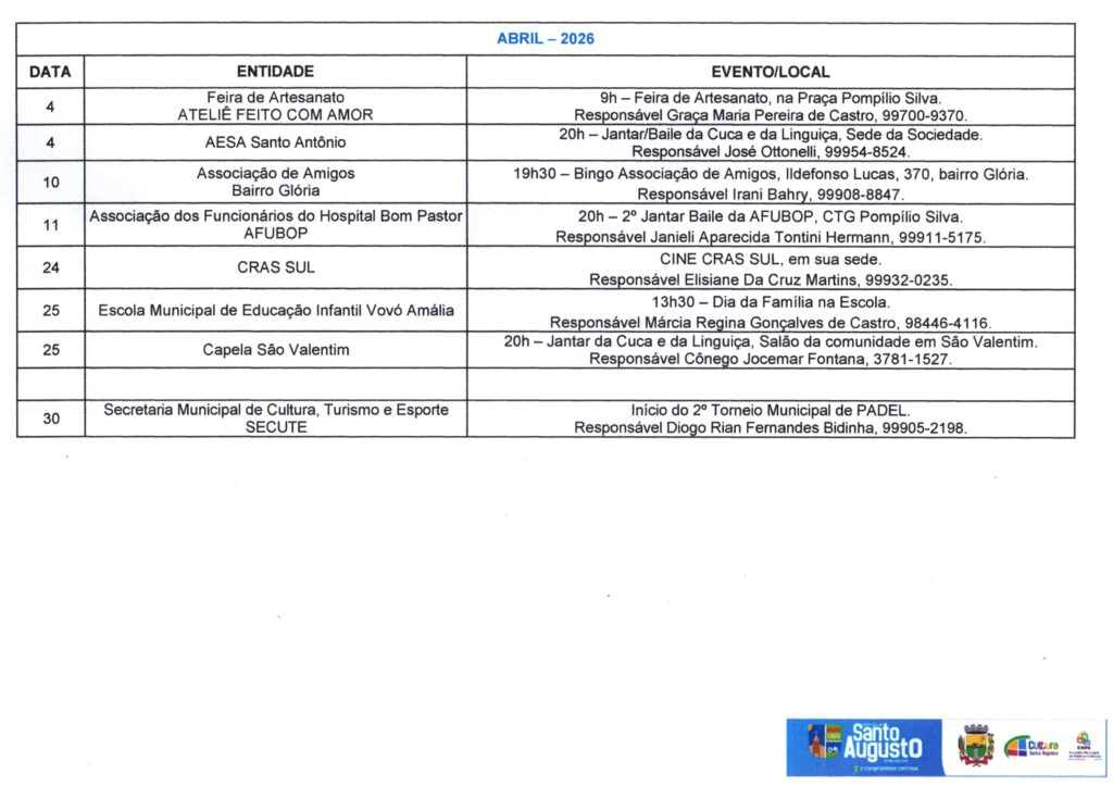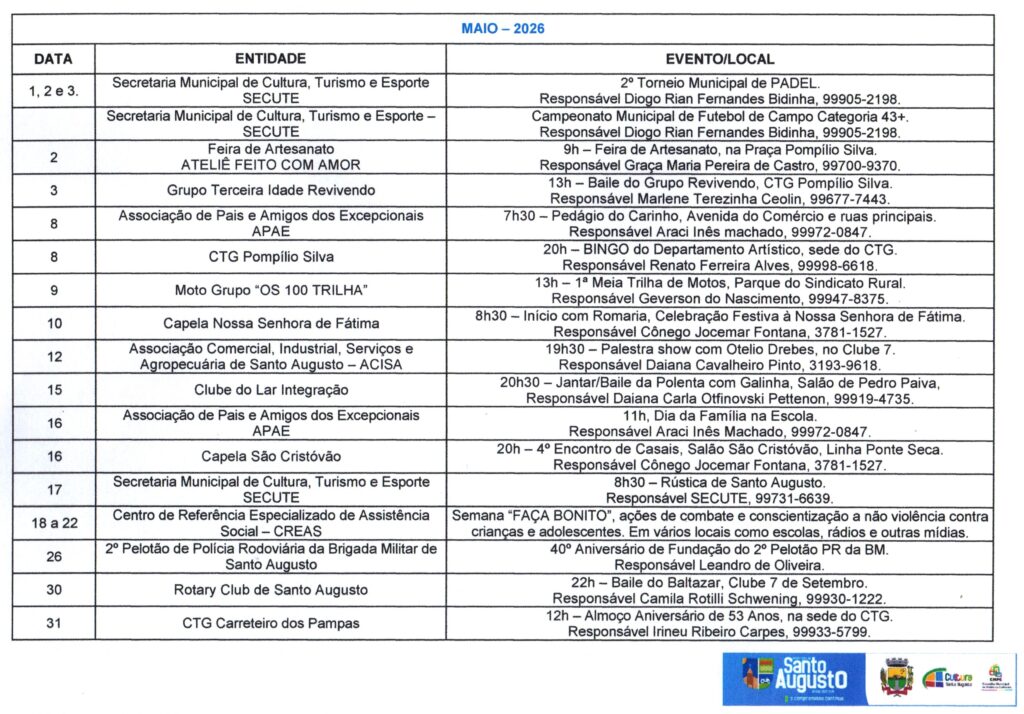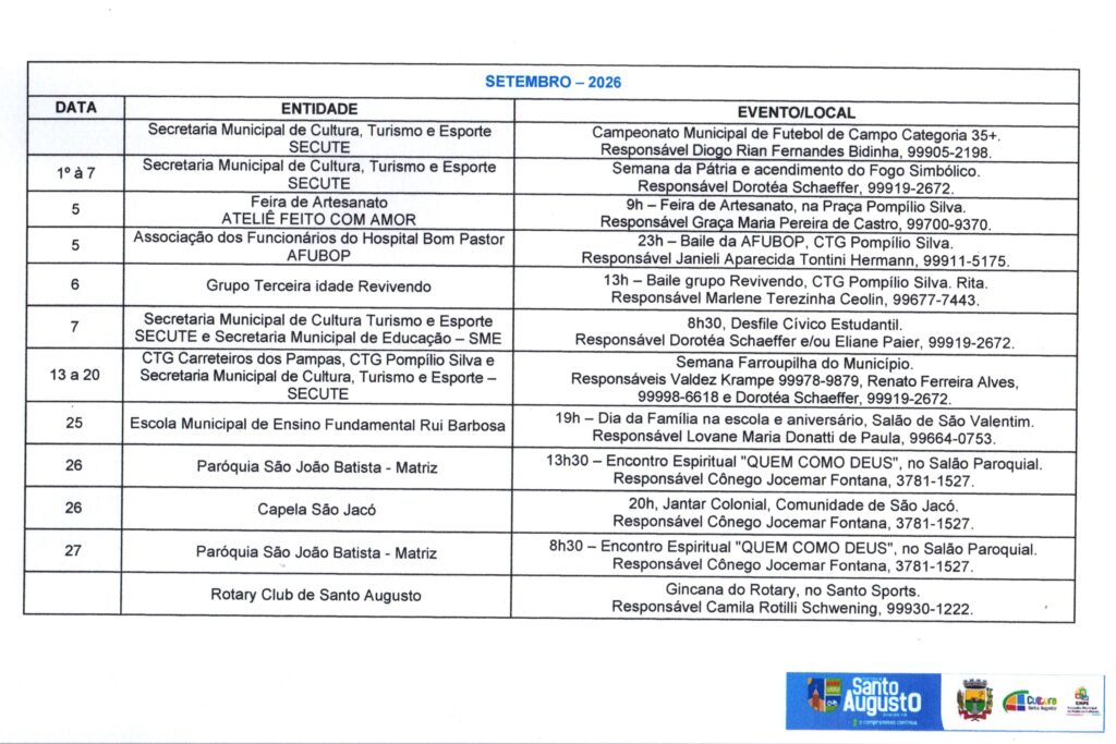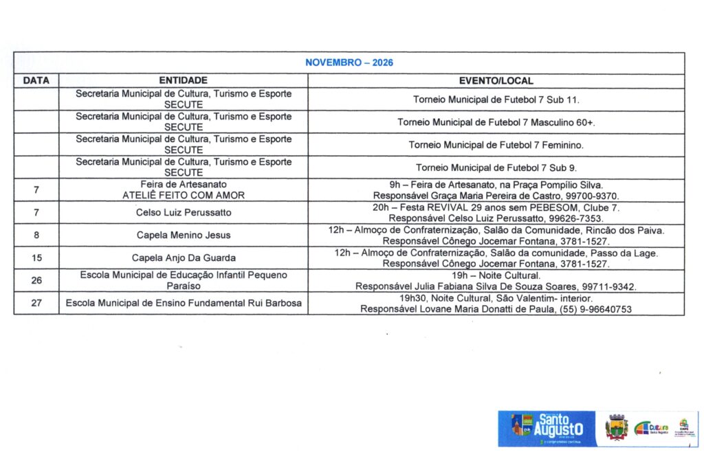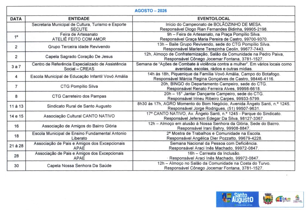 (Esse processo substitui o antigo Calendário de Eventos do Município) ?Nesta sexta-feira, 17 de janeiro, a Secretaria Municipal de Cultura, Turismo e Esporte – SECUTE comunicou sobre o CALENDÁRIO Anual de Atividades – CAA do ano de 2025, que, a partir de agora deverá ser preenchido no Formulários Google, através do link https://forms.gle/p7pQU9fhtgRrgDro9 ATÉ O DIA 28 DE FEVEREIRO. ?O Calendário Oficial de Eventos do Município está presente na SECUTE há tempos. Porém, desde a criação do Conselho Municipal de Políticas Culturais – CMPC, instituído pela Lei Municipal N.º 3.282, de 5 de julho de 2023, que é o órgão consultivo na formulação, acompanhamento e avaliação da política cultural do município de Santo Augusto/RS, foi instaurado, em seu Regimento Interno, o CALENDÁRIO Anual de Atividades – CAA. ?A partir deste ano, o CAA será com inscrição dos eventos de forma online, com prazo para preenchimento e à disposição de toda comunidade em formato digital, logo após a divulgação em DECRETO OFICIAL (março), facilitando a informação, consulta e acesso, bem como a organização de datas/dias. ?Encerrado o prazo, será divulgado, oficialmente, através de Decreto Municipal com Anexo do CAA e todos os eventos devidamente efetivados. Aqueles EVENTOS que não forem cadastrados no período divulgado, até poderão acontecer, mas não farão parte deste Decreto Oficial. ?Colocamo-nos à disposição para quaisquer informações ou esclarecimentos. Agradecemos pela atenção. Secretária Municipal Dorotéa Schaeffer – SECUTE e Ana Paula da Rosa Reis, Coordenadora de Cultura e Turismo e Presidente do CMPC. Por: Ana Paula da Rosa Reis, Coordenadora de Cultura e Turismo e Presidente do CMPC.
