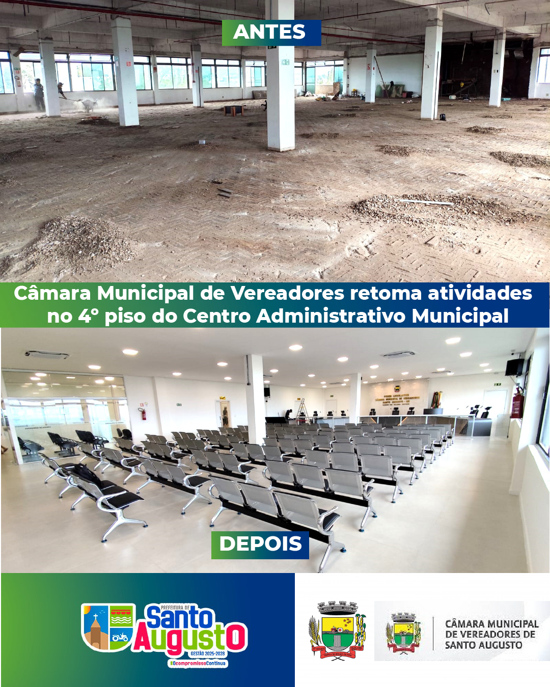 Já no dia 30 de junho de 2025, após a assinatura do Contrato de Empreitada Global nº 01/2025, firmado entre o Legislativo Municipal e a empresa Soares Construtora e Incorporadora Ltda., vencedora do Processo Administrativo nº 014/2025, com sede no município de Coronel Bicaco/RS, teve início a execução das obras de reforma do 4º pavimento do Centro Administrativo Municipal.