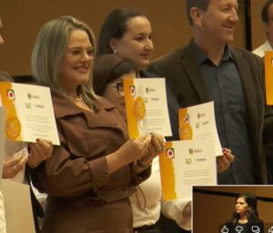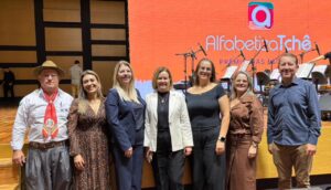 🔠Na manhã desta segunda-feira, 27 de abril de 2026, nas dependências da Casa da OSPA, em Porto Alegre, uma caravana marcou presença para receber o Prêmio Alfabetiza Tchê 2024. A comitiva foi composta pelo vice-prefeito Dilmar Mattioni, pela secretária de Educação Eliane Paier, pela articuladora do programa no município, Lilian Baugratz de Oliveira, além dos representantes das escolas premiadas – da EMEF Sol Nascente a diretora Cristiane e a professora Geovana e pela EMCMEF São João, o diretor Leandro e a professora Joeli.