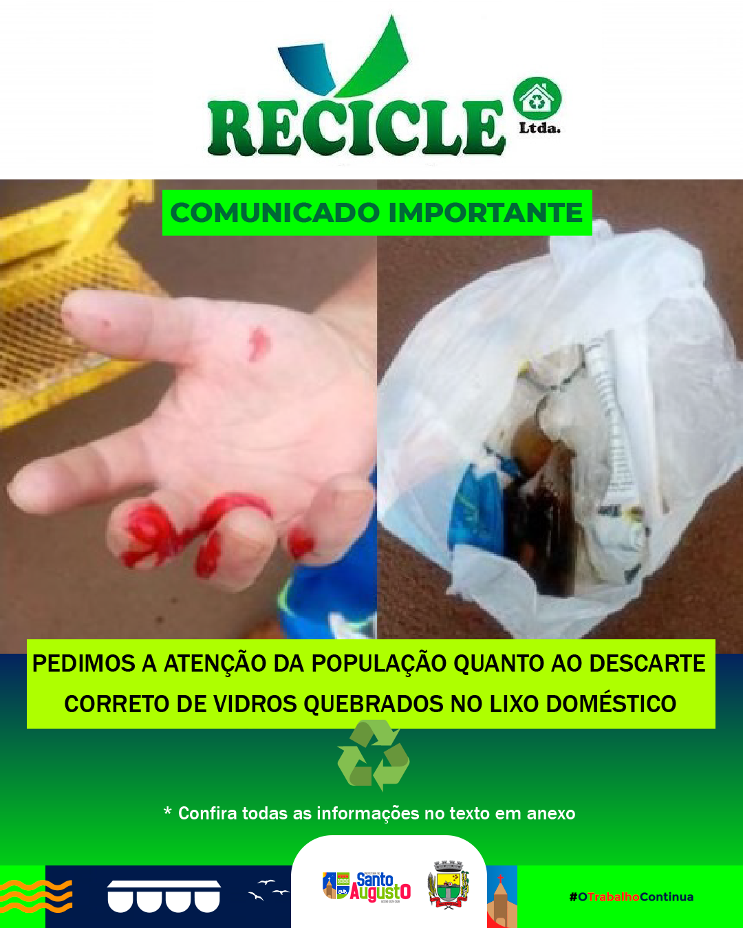 A Secretaria Municipal de Obras, Viação e Trânsito (SMOV), por meio da empresa responsável pela coleta de resíduos no município, Recicle, informa e solicita a colaboração de toda a comunidade quanto ao descarte correto de vidros quebrados no lixo doméstico.
