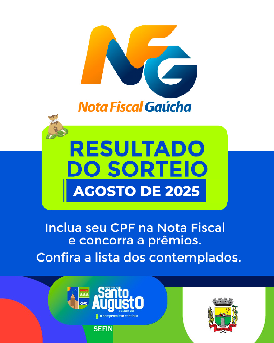 A Administração Municipal, por meio da Secretaria de Finanças (SEFIN), divulga os nomes dos contemplados no sorteio do Programa Nota Fiscal Gaúcha (NFG), referente ao mês de agosto de 2025.
