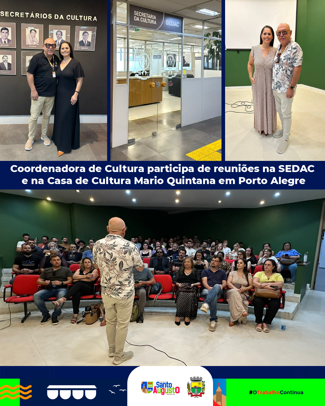 Nesta terça-feira, dia 27 de janeiro, a Coordenadora de Cultura de Santo Augusto, Ana Paula da Rosa Reis, esteve em reunião de trabalho na Secretaria Estadual da Cultura (SEDAC), onde se reuniu com o Diretor-Geral Ruben Francisco de Oliveira. O encontro teve como objetivo alinhar projetos e tratar de assessorias voltadas ao fortalecimento das políticas culturais no município. Entre os assuntos abordados estiveram o PNAB – Ciclo 2, a Feira do Livro e outros recursos vinculados à área cultural, visando ampliar o acesso do município a programas de fomento e investimento no setor cultural.