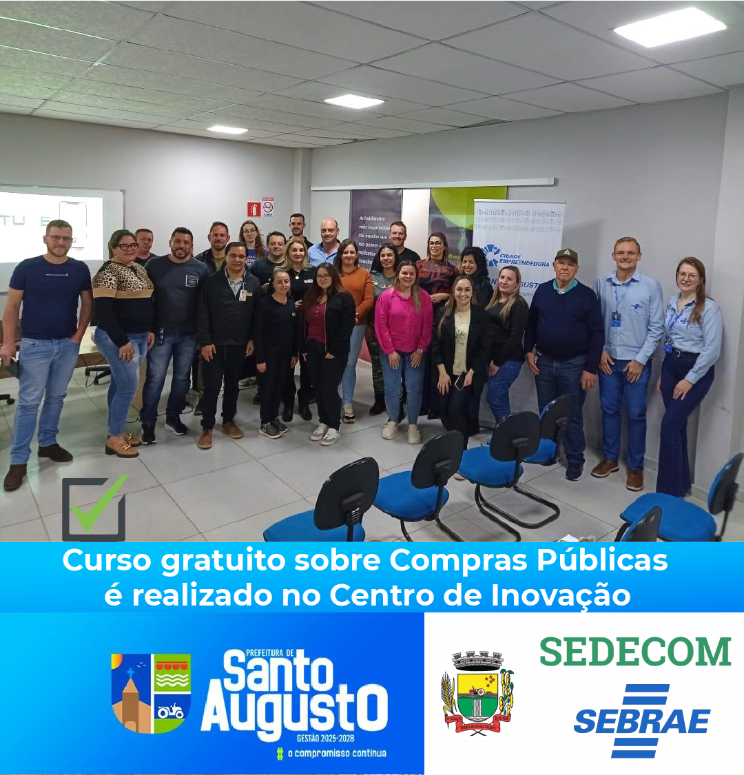 📍 Nos dias 14 e 15 de julho, foi realizada, pela segunda vez neste ano, a capacitação gratuita “Participação em Compras Públicas”, no Centro de Inovação de Santo Augusto. A iniciativa teve como foco qualificar empreendedores e empresas locais para atuarem em processos licitatórios junto à Administração Pública.