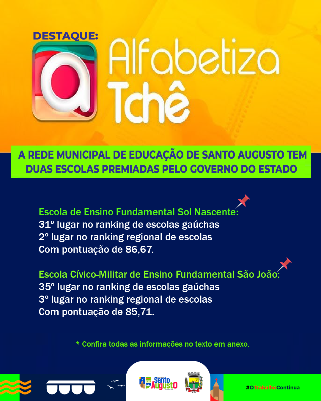 O prêmio reconhece as 2️⃣0️⃣0️⃣ melhores escolas do Estado do Rio Grande do Sul. Com grande alegria, a Secretaria Municipal de Educação (SME) destaca que o município de Santo Augusto conta com duas escolas da rede municipal classificadas para receber o Prêmio Alfabetiza Tchê 2024. São elas: