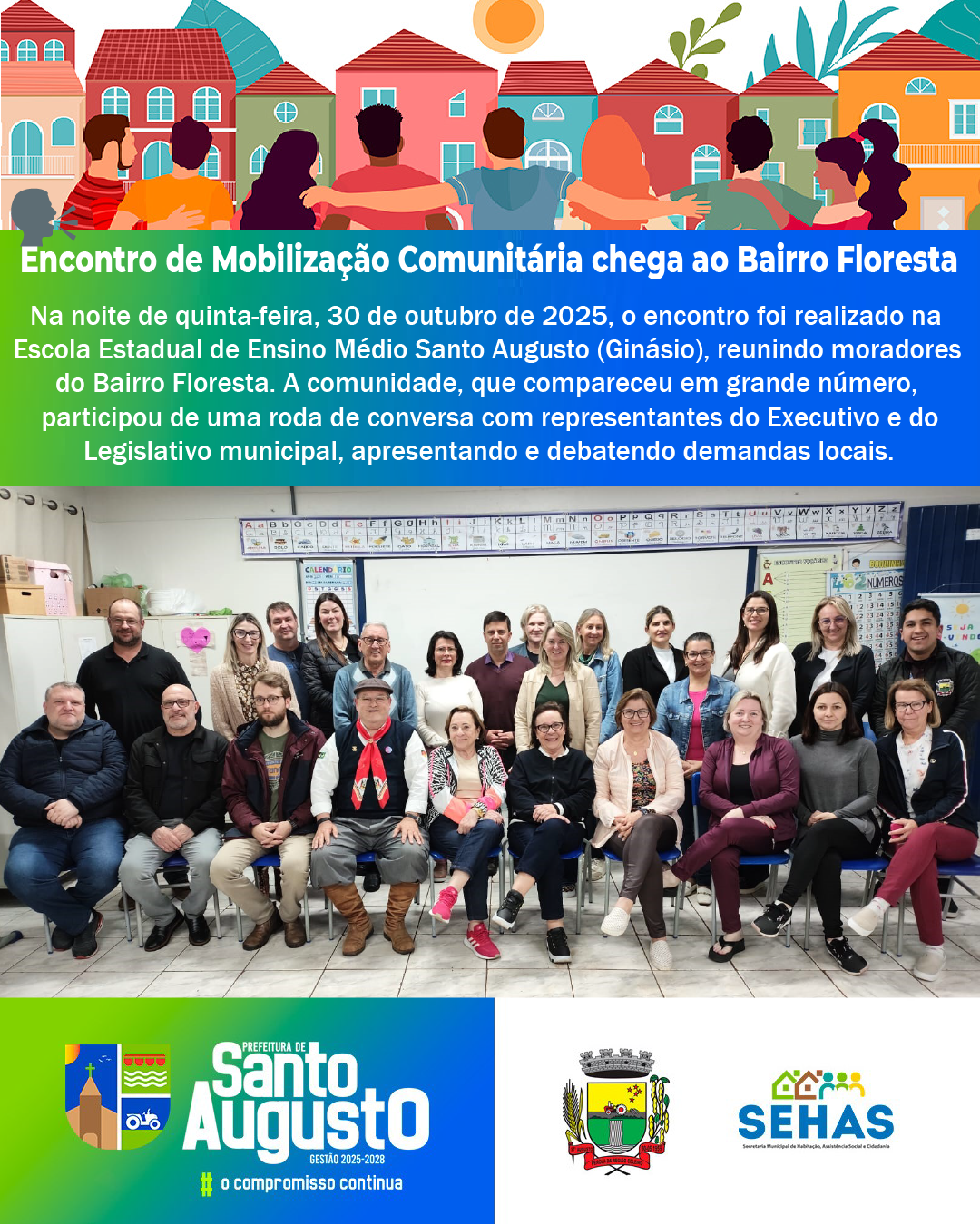 Na noite de quinta-feira, 30 de outubro de 2025, o encontro foi realizado em uma das salas da Escola Estadual de Ensino Médio Santo Augusto – Ginásio, reunindo moradores do Bairro Floresta. A comunidade, que compareceu em grande número, participou de uma roda de conversa com representantes do Executivo e do Legislativo Municipal, apresentando e debatendo demandas locais.