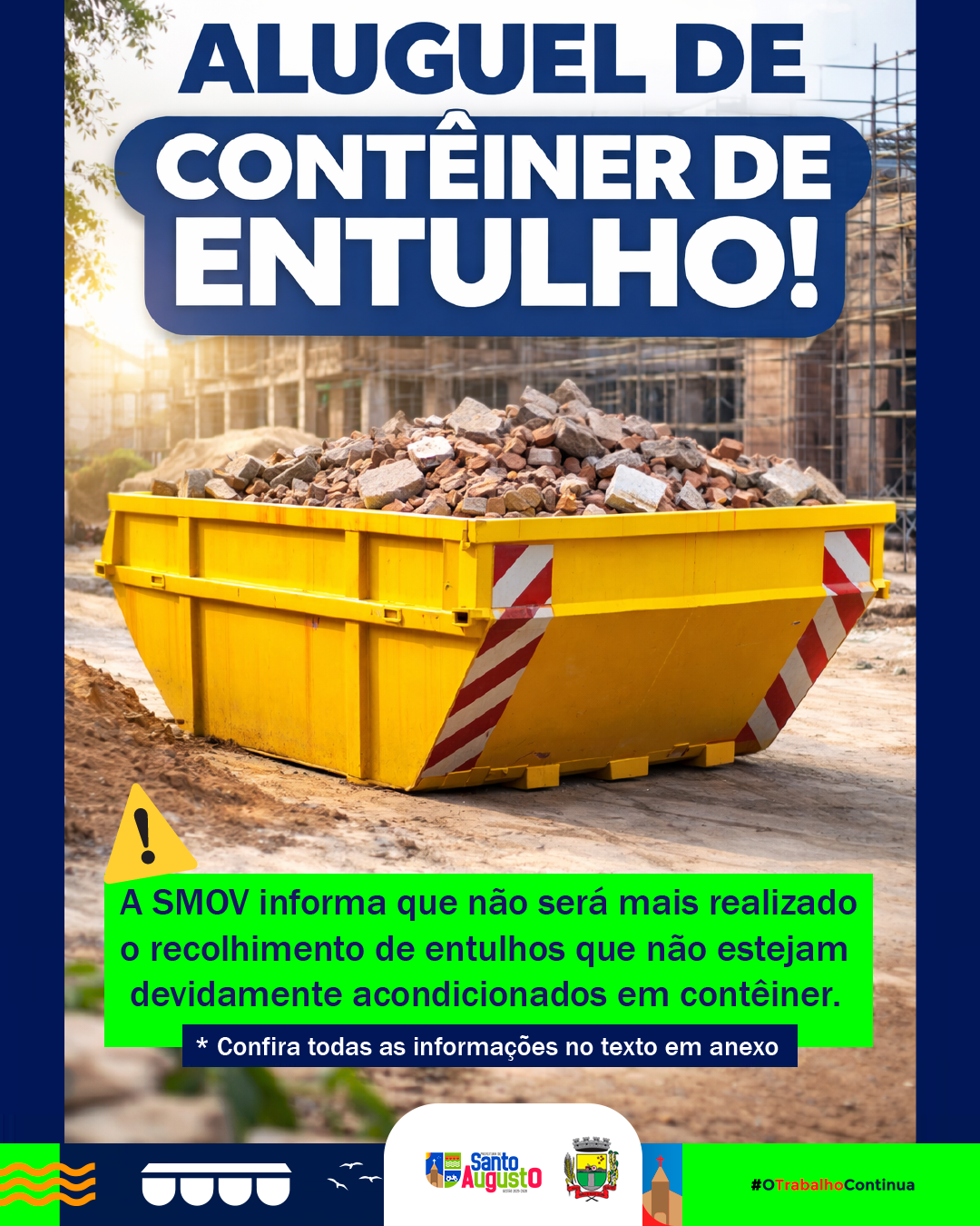 A Secretaria de Obras, Viação e Trânsito (SMOV) informa que a locação de contêiner foi retomada. ▶️ A partir de agora, não será mais realizado o recolhimento de entulhos que não estejam devidamente acondicionados em contêiner.