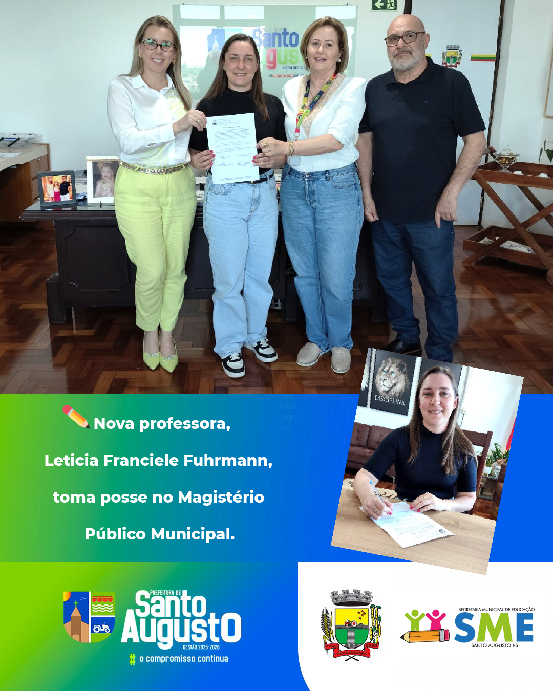 Na tarde desta quinta-feira, 06 de novembro de 2025, no gabinete da prefeita, foi realizada a cerimônia de posse da nova servidora Leticia Franciele Fuhrmann, que assumirá o cargo de Professora II, com carga horária semanal de 20 horas, pertencente ao Quadro de Cargos do Magistério Público Municipal.