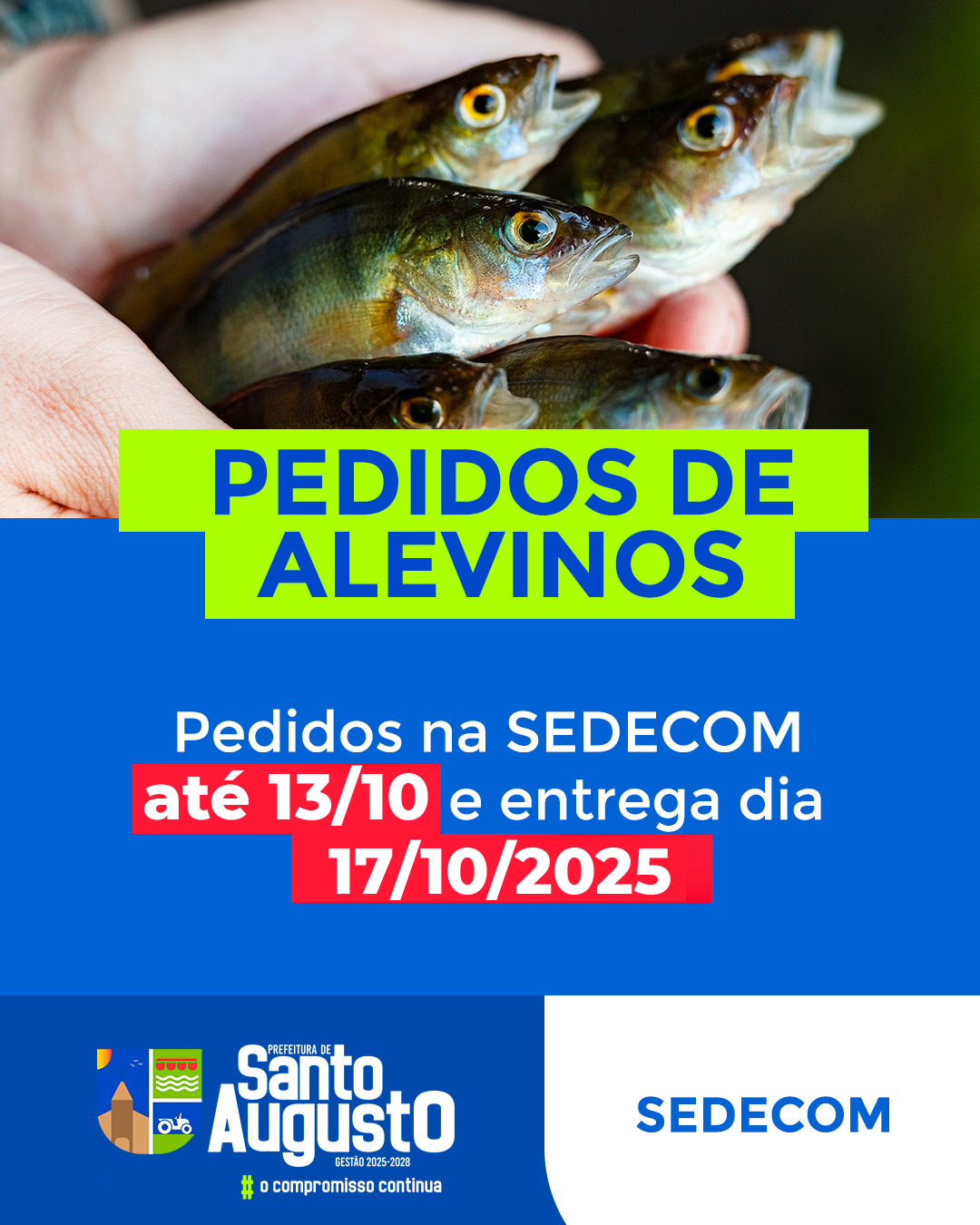 A entrega dos alevinos está prevista para o dia 17 de outubro de 2025.