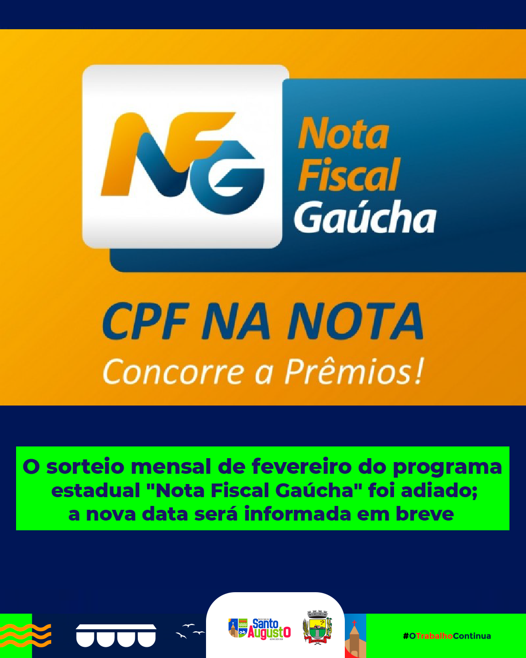 O 💱 sorteio mensal de fevereiro do programa estadual “Nota Fiscal Gaúcha” foi adiado; a nova data será informada em breve