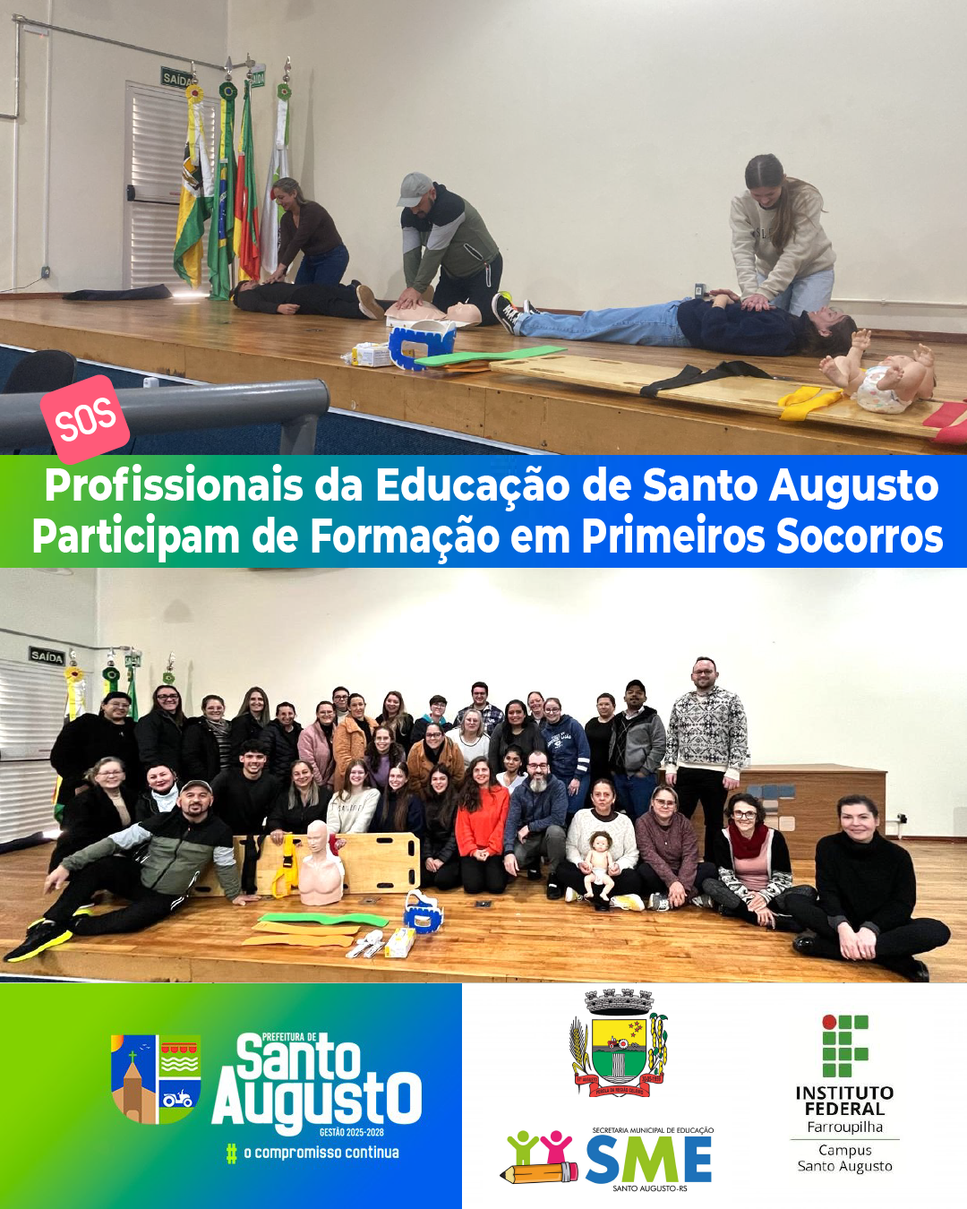 Nos dias 28 e 29 de julho de 2025, a Secretaria Municipal de Educação de Santo Augusto, em parceria com o Instituto Federal Farroupilha – Campus Santo Augusto (IFFar), promoveu capacitação voltada às equipes diretivas, secretários(as) escolares e monitores da rede municipal de ensino. O curso teve como foco o atendimento de primeiros socorros no ambiente escolar, conforme previsto na Lei Lucas (nº 13.722/2018).