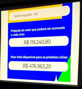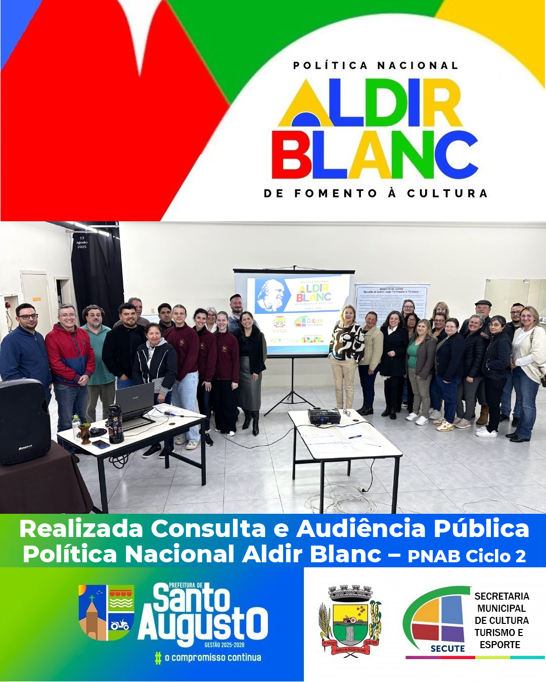 O Vice-Prefeito Dilmar Mattioni saudou os presentes e evidenciou a importância desses projetos culturais para o bem estar social e evolução humana. A Secretária Prof.ª Dorotéa Schaeffer ao fazer suas colocações, além de saudar a todos, divulgou uma conquista de verba estadual para o fomento, onde Santo Augusto teve seu projeto aprovado no Fundo de Apoio à Cultura – FAC, PRÓ-CULTURA e serão mais R$ 100.000,00 investidos aqui. A Presidente Ana Paula retomou a palavra e fez a apresentação sobre a PNAB Ciclo 2 com suas características novas e o Plano Anual de Aplicação dos Recursos – PAAR Plurianual (2026-2029).