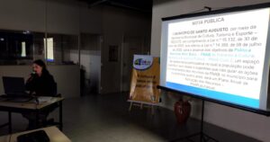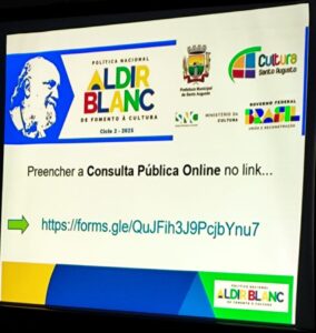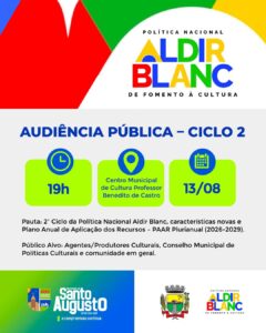 A comunidade cultural Santo-augustense, os membros da Comissão de Avaliação da PNAB Ciclo 1/2024, o Conselho Municipal de Políticas Culturais – CMPC e os servidores da Secretaria Municipal de Cultura, Turismo e Esporte – SECUTE estiveram participando da Audiência Pública presencial na noite desta quarta-feira, dia 13 de agosto, no Centro Municipal de Cultura Professor Benedito de Castro. A Coordenadora de Cultura e Turismo e Presidente do CMPC Ana Paula da Rosa Reis, coordenou a segunda audiência sobre a Política Nacional Aldir Blanc – PNAB Ciclo 2 de Fomento à Cultura, realizada com a presença de pessoas interessadas nos projetos culturais.