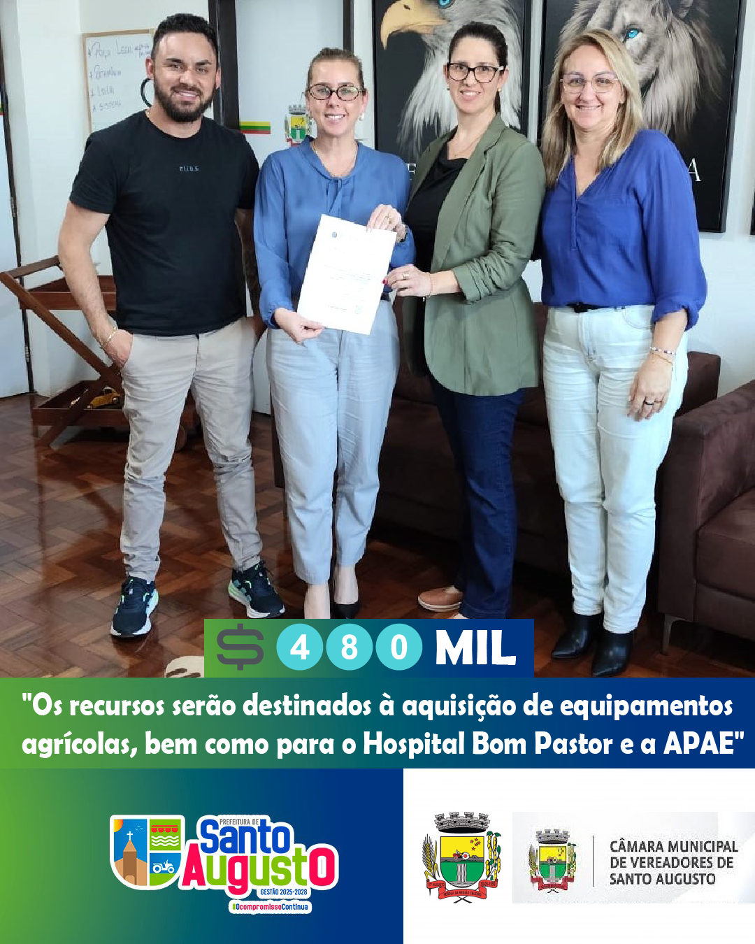 O recurso, será repassado ao Município de Santo Augusto por meio de Transferência Especial, com o objetivo de viabilizar a aquisição de equipamentos agrícolas, fortalecendo o setor primário e contribuindo diretamente com o desenvolvimento da agricultura local, as melhorias na saúde através do Hospital Bom Pastor e investimentos na APAE.