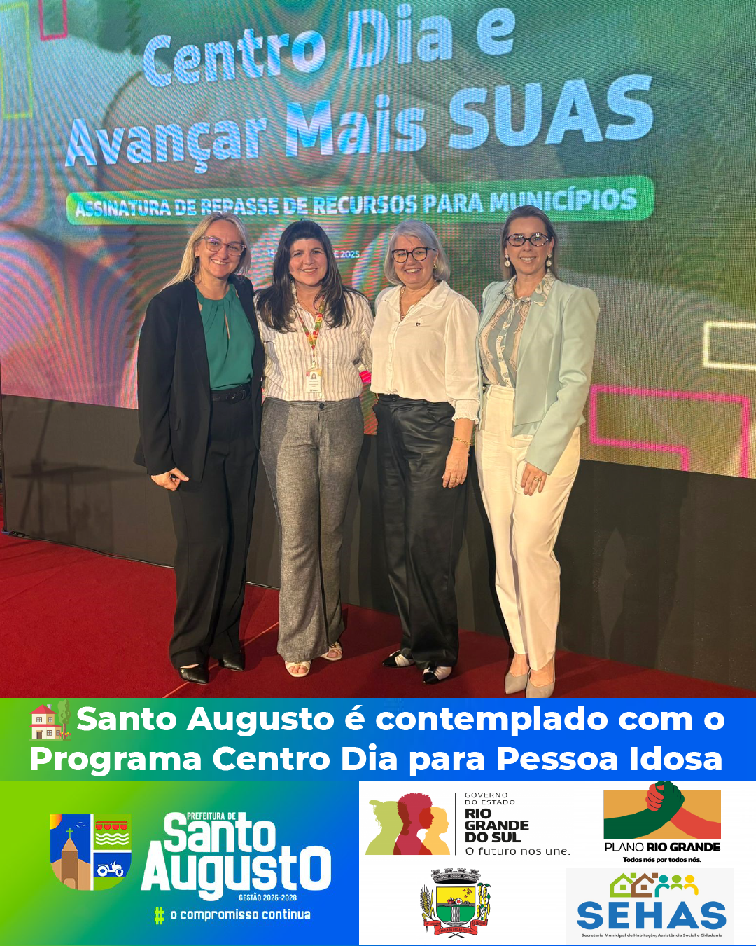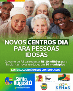Entre os beneficiados com o Programa Centro Dia para Pessoa Idosa está Santo Augusto, que integra o grupo de 20 municípios contemplados com o repasse de R$ 950 mil cada, somando R$ 19 milhões na segunda edição do programa. A iniciativa tem como objetivo a implantação de unidades de atendimento para pessoas idosas com algum grau de dependência e suas famílias, oferecendo espaços de cuidado, acolhimento e proteção.