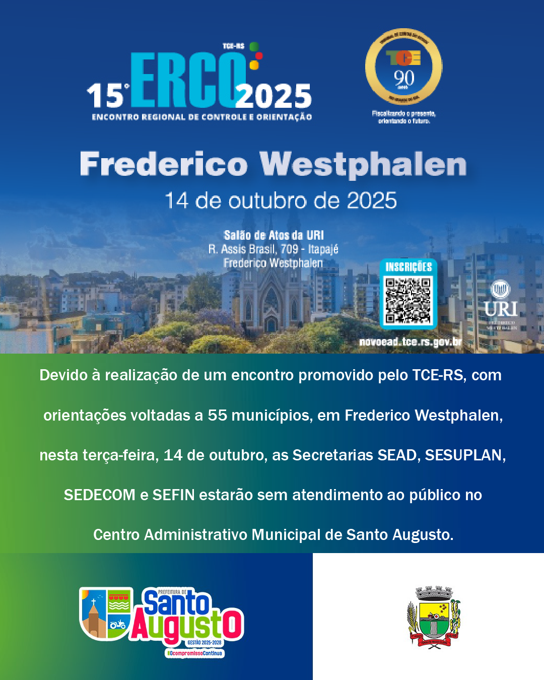 O Tribunal de Contas do Estado do Rio Grande do Sul (TCE-RS) realiza, nesta terça-feira, 14 de outubro, a 15ª edição dos Encontros Regionais de Controle e Orientação (ERCOs), na cidade de Frederico Westphalen. O evento acontece das 9h às 17h30, no Salão de Atos da Universidade Regional Integrada do Alto Uruguai e das Missões (URI).