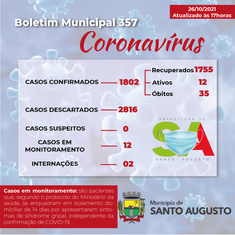 BOLETIM MUNICIPAL ? CORONAVÍRUS Nº 357 – 26/10/2021 (O boletim tem os mesmos dados da edição de ontem, 25/10/2021)
