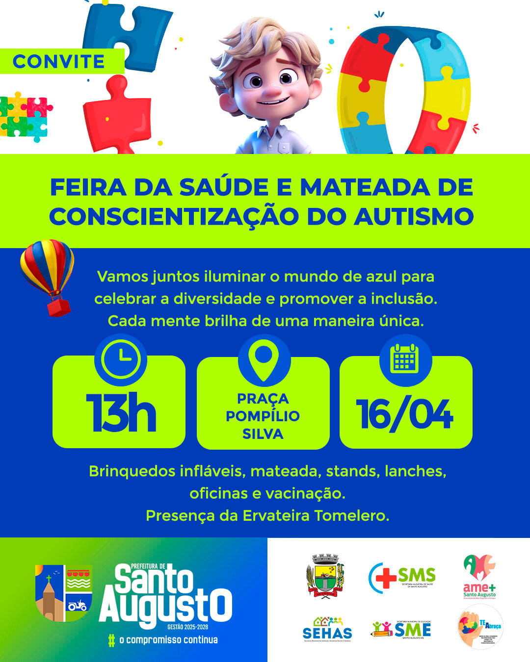 ?As Secretarias Municipais de Saúde, Educação e Assistência Social, com o apoio das demais secretarias, do Centro TEAbraça e da AME+ Santo Augusto, convidam você para uma tarde especial dedicada à conscientização sobre o autismo.
